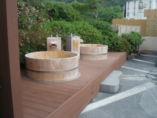 露天風呂は、大きな岩風呂と、樽風呂が二つあり、樽風呂は、自分で熱さを調節できます。