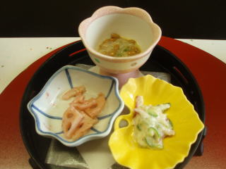 まずは先付けと、梅酒で乾杯し、ご飯を最初に、持ってきてもらいました。