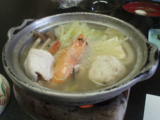 鯛と、エビと、はまぐりが入って、野菜とうどん、鶏肉も入ってボリューム満点です。