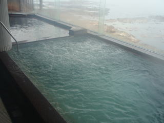 新館の方に、海に面した展望風呂と露天風呂があります。ここからは、あの海沿いの露天風呂が見えます。