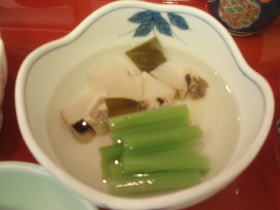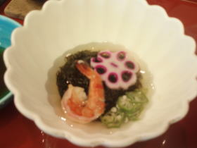 最初は、先付けの酢の物を食べ、アワビの水煮を食べました。