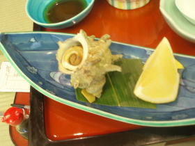 そのあと、サザエのつぼ焼きを食べたんですが、こんな肉厚で、味がしみた、つぼ焼きは、初めて食べました。うまかったですねー。なぜか、グレープフルーツ付きでした。