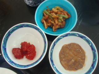 朝から、すじこ、イカの塩辛、茄子味噌、ナメコの辛醤油あえ、ハタハタの塩焼きが、食べれたので、よかったです。
