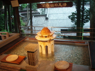 内湯は、真ん中に一つ大きいのがあり、露天は、そこから階段で上がると、展望の素晴らしい、岩風呂がありました。
