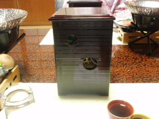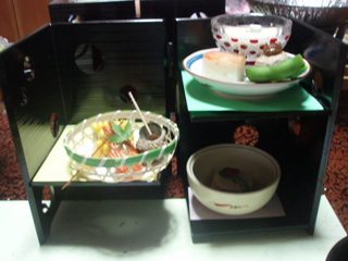 まず、この入れ物が、凄いんです。なんと観音開きになってて、3つ小鉢が入ってました。\(^O^)/