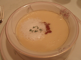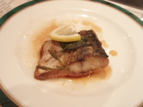 ちなみに、夏のムーンライトコースは、前菜が、白身の魚と、白かびのソーセージ乗せトマトソース、冷製コーンポタージュスープ魚介のコンソメジュレ、メインが、スズキのポアレです。