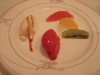 デザートは、カシスとバニラのアイスに、キウイ、オレンジ、グレープフルーツ、キウイが、添えてました。