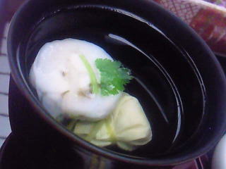 このお吸い物の中には、小さい巾着の中に、胡麻豆腐が入ってたんです。いい仕事してますねー。