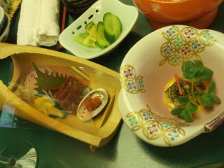 そして、今日のラインナップは、牛ステーキの陶板焼き、素晴らしいお造り、お惣菜盛り合わせ、手作り豆腐、馬刺し、煮物、揚げ物、エビと山菜の炒めもの、茸の釜飯、お吸い物、デザート盛り合わせです。