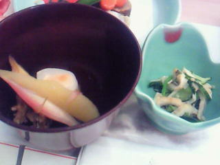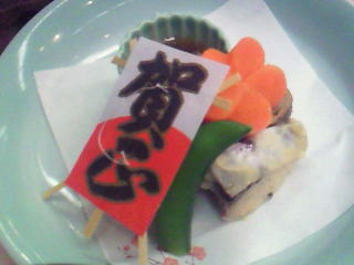 マグロの刺身がありましたよー。まいたけのホウバ焼き、お雑煮、おしるこ、鰆の煮物がうまかったです。