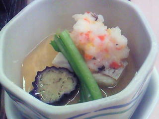 やはり数の子うまいし、サーモンもおいしいですねー。椀盛は、梅花豆腐とほたてのすまし汁、しめじ、小松菜の土瓶蒸しです。