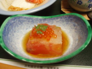 トマトの枠の中に、みじん切りの玉葱が詰まってて、だしがかかってます。その上に、いくらが乗ってるのが、アクセントでうまいです。