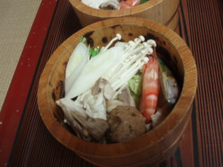 樽の中に、とり団子、まいたけ、もだし、エビ、白菜、ネギ、パーナ貝が入ってて、だしを入れたあと、熱々の石を中に入れます。