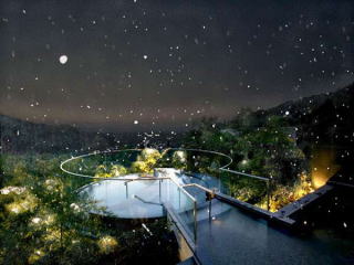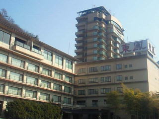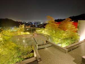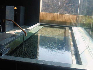 建物からせり出した露天風呂が有名で、夜はライトアップされて、暗やみのなかで、浮いたような感じに見えます。