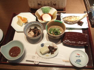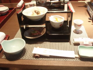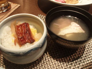 食事は、ご飯の上に鰻の蒲焼きが乗ってて、お吸い物は、冬瓜をすりおろしてるので、とろみが出てうまかったです。