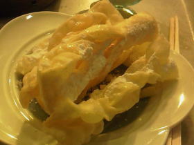 餃子の生地を揚げて、その上に練乳と、粉砂糖がかかったものですが、素朴な味で、かつ濃厚でうまいんです。