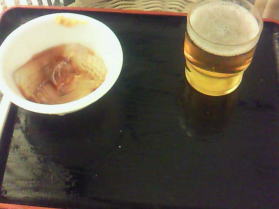 まずプレミアムモルツと、ポッブコーンで楽しみ、ところてん、ヨーグルトを食べて、向こうが間違えて、ビールをまたゲット!もうふらふらです。