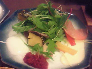前菜は、マヨネーズ、辛子系ドレッシング、ヨーグルトドレッシングの3種を使った、ハーブサラダです。生ハム入り。いろんな味が