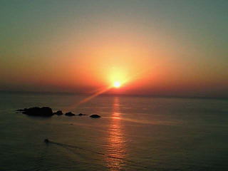ホテル浦島から見た朝日です。右は、ホテル中ノ島の上から、朝日が出てきました。